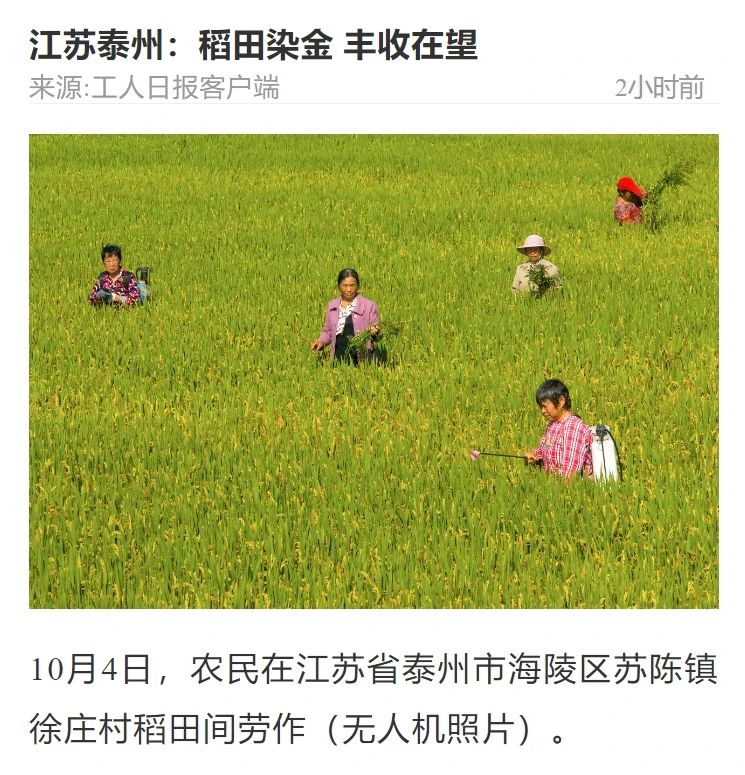10月4日,工人日报客户端以组图形式发布《江苏泰州:稻田染金 丰收在望》,聚焦海陵水稻田间管理。