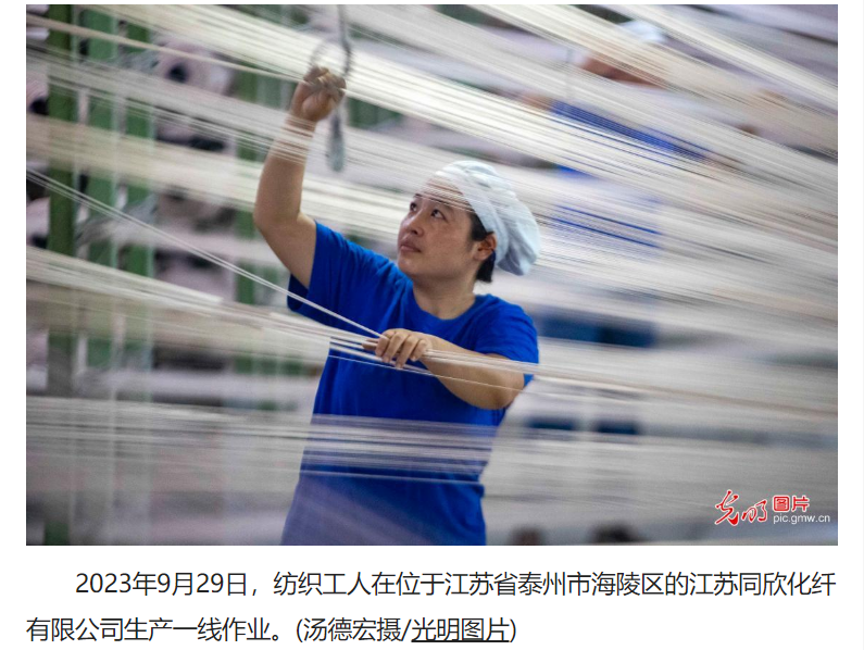 9月29日,新华网发布组图,其中一张聚焦海陵区的江苏同欣化纤有限公司纺织工人在生产一线作业。