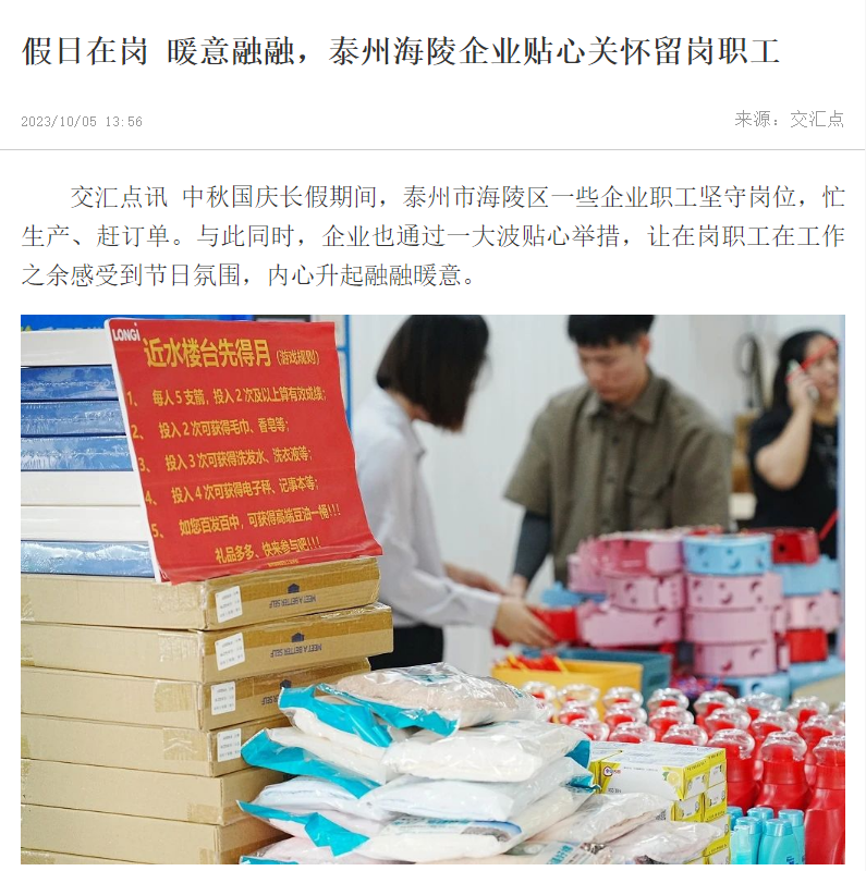 中秋国庆长假期间,海陵区一些企业职工坚守岗位,忙生产、赶订单。与此同时,企业也通过一大波贴心举措,让在岗职工在工作之余感受到节日氛围,内心升起融融暖意。
