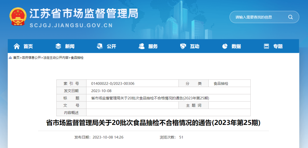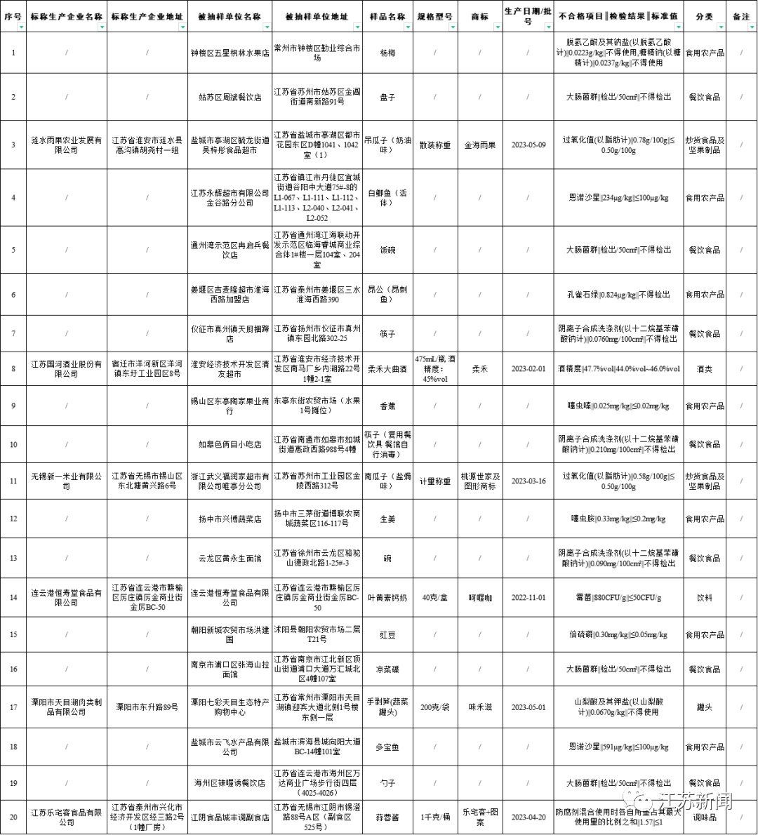 近期,江苏省市场监督管理局组织食品安全抽检,抽取薯类和膨化食品、食糖、食用农产品、糕点、粮食加工品、调味品、罐头、酒类、蔬菜制品、炒货食品及坚果制品、肉制品、水产制品、饼干、餐饮食品、速冻食品、乳制品和饮料等17大类食品726批次样品,检出其中餐饮食品、炒货食品及坚果制品、调味品、罐头、酒类、食用农产品和饮料等7大类食品20批次样品不合格。