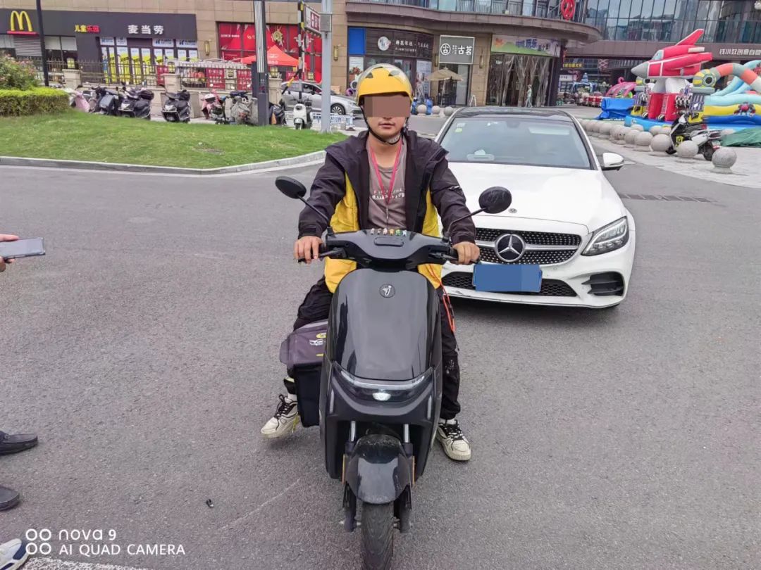 接到报警后,三水中队的民警迅速赶往现场处置。调取现场监控后民警发现:事发时,外卖小哥由北向南逆行至万达广场出入口处时,一辆白色轿车刚好由东向西进入路口,由于外卖小哥速度快,猝不及防两车发生剐蹭,外卖小哥连人带车倒在地上。