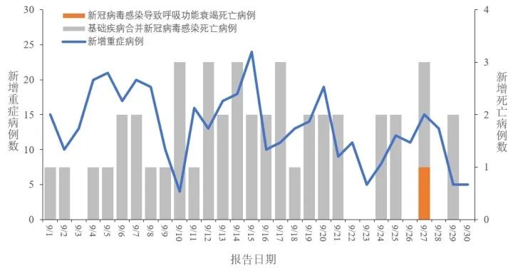 2023年9月1日-9月30日,全国31个省(自治区、直辖市)及新疆生产建设兵团报告新增重症病例398例、死亡病例45例(其中新冠病毒感染导致呼吸功能衰竭死亡病例1例、基础疾病合并新冠病毒感染死亡病例44例)。见图1。