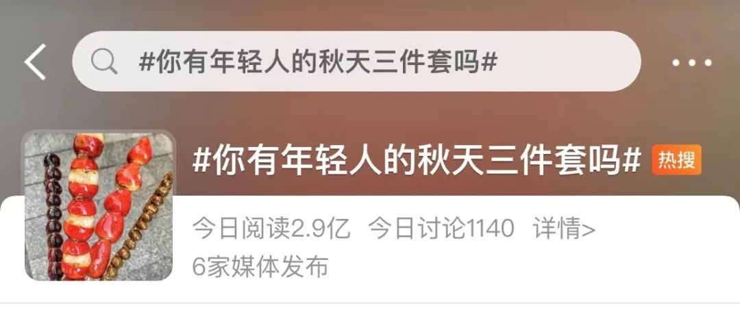 寒露过后,天气渐渐变冷,各地好像都5G入秋了。近日,#你有年轻人的秋天三件套吗#登上微博话题榜。