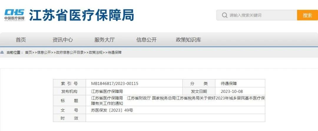 江苏省医疗保障局 江苏省财政厅 国家税务总局江苏省税务局 2023年10月8日