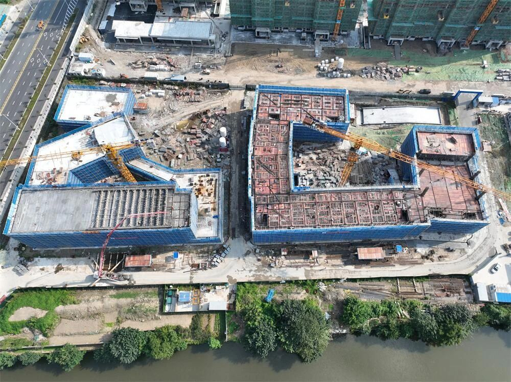 从航拍照片来看,小学部也即将进入封顶阶段。为什么两栋楼同时开工,一快一慢,因为幼儿园没有地下室,所以进度比较快, 小学部分则有地下室工程,所以工程量更大,进度相对慢一些,但目前也已进入地上工程施工阶段。