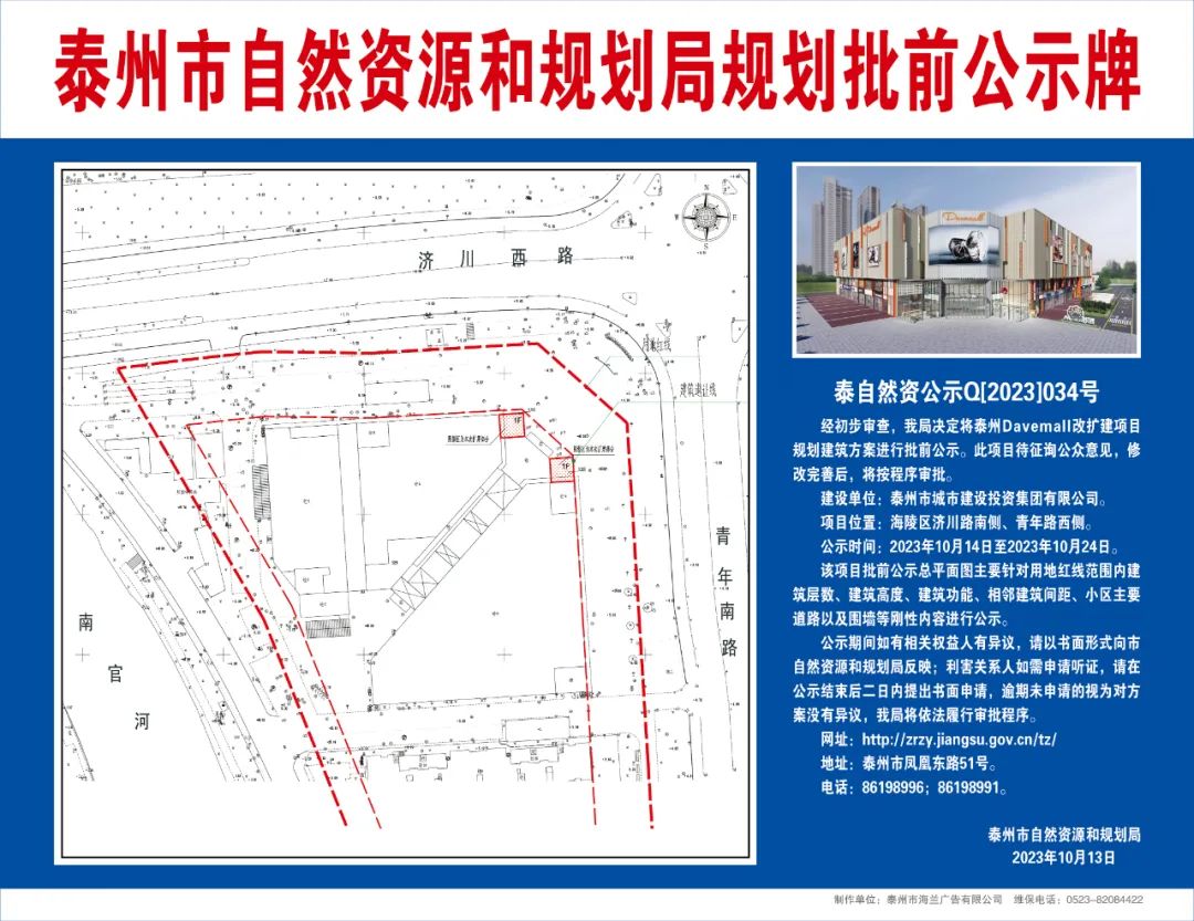 10月13日,泰州市自然资源和规划局网站对泰州Davemall改扩建项目规划建筑方案进行了批前公示。