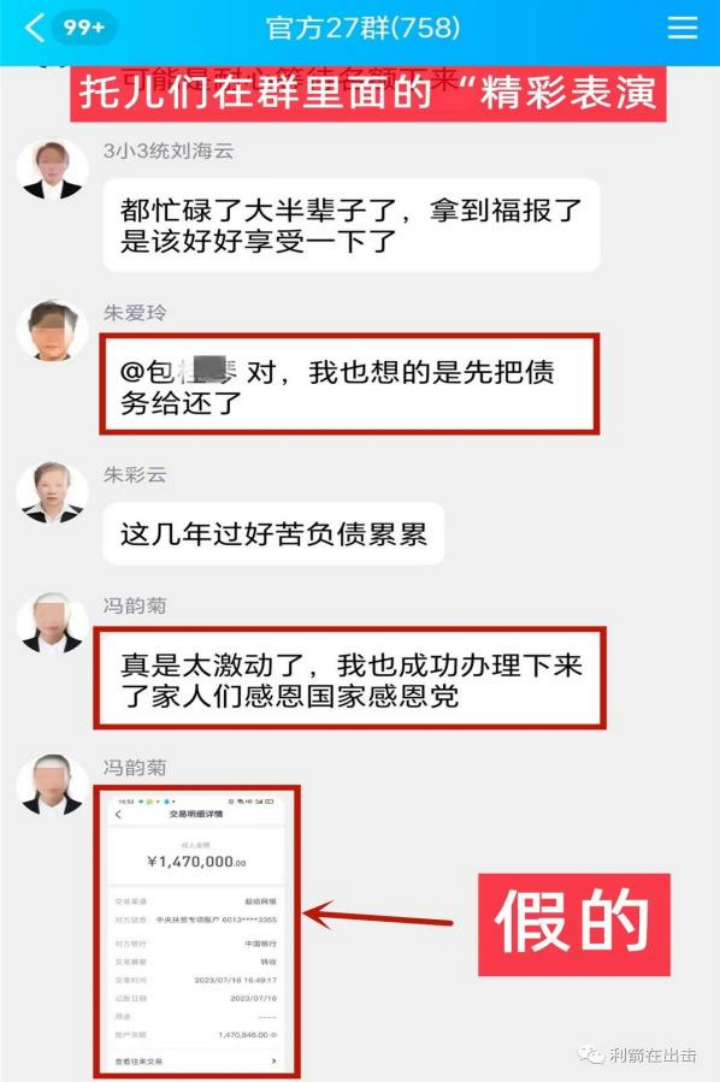 骗子伪装成所谓的国家扶贫办,通过电话、发送电子邮件、邮寄假公文等方式,发布虚假的扶贫放款信息,引导受害人添加好友或扫码加入群聊。