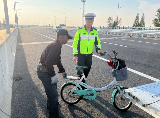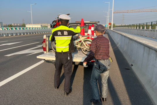 10月18日16时许,交警姜堰大队梁徐中队接到驾驶员报警,有一名老大爷骑着自行车在姜堰南绕城大唐电厂路段高架路段逆向行驶,情况十分危险。