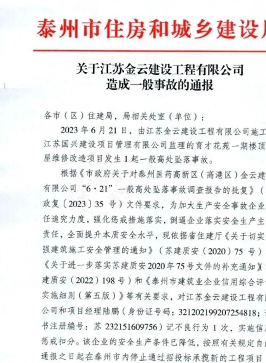 [聚焦民生] 关于泰州某工地发生安全事故的相关通报