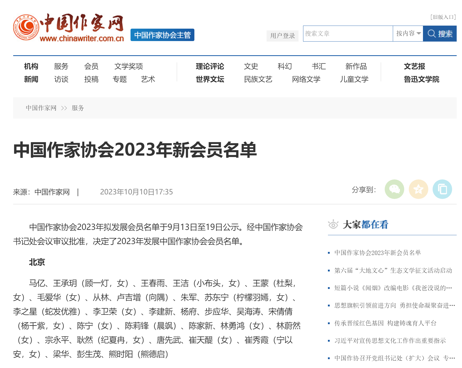 近日 中国作家协会2023年度 新会员名单公布 靖江籍作家邵秀萍成功加入 目前靖江共有8人加入中国作家协会