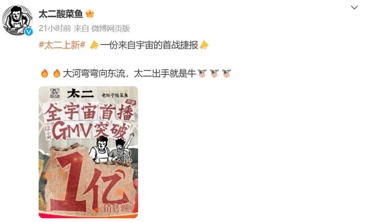 值得注意的是,就在此消息传出的前一日,太二酸菜鱼在抖音开通直播,首播12小时商品交易总额突破1亿元。