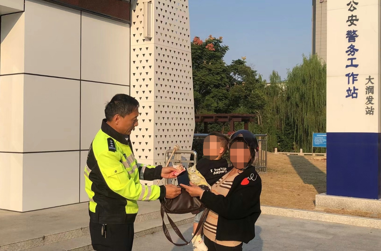 很快,肖女士从家中赶到位于大润发超市的公安交警警务工作站,张万根接待了她。经现场清点,包内除一部手机外,还有100多元现金等完璧归赵。