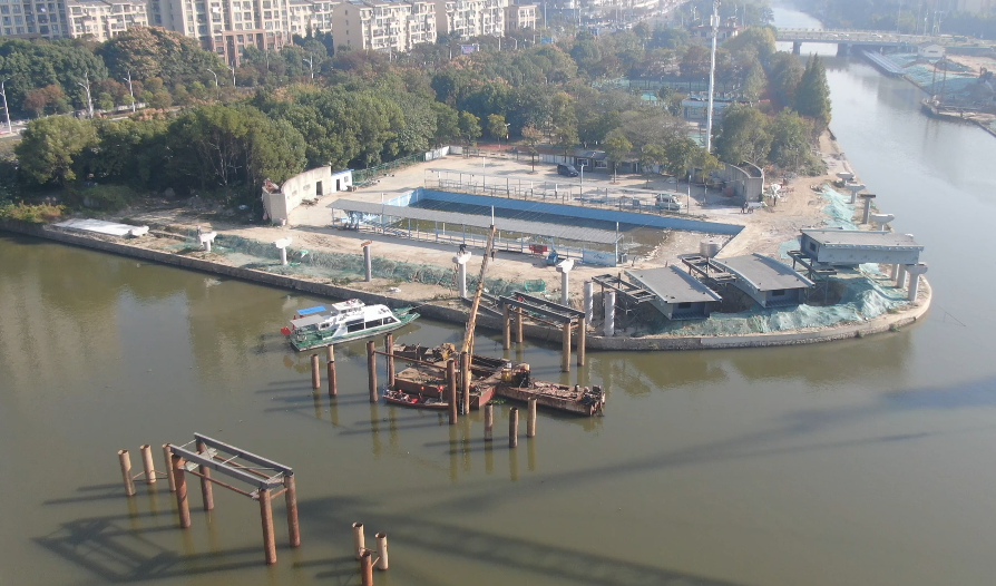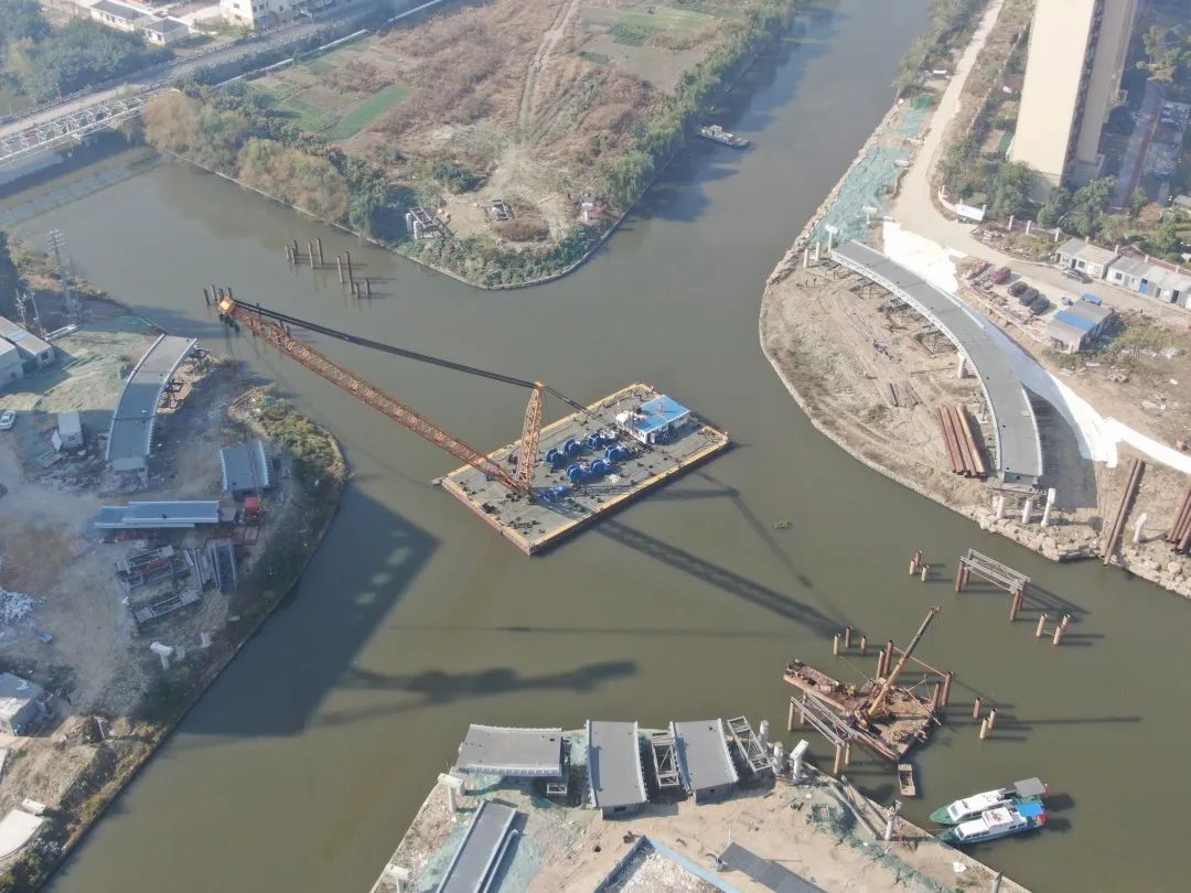 在“三水之环”项目建设现场,大型浮吊船吊臂高耸,几十名工人各司其职地忙碌着,现场一派大干快上、热火朝天的景象,建设中的慢行景观桥正逐渐成型,在蓝天白云的映衬下气势磅礴。