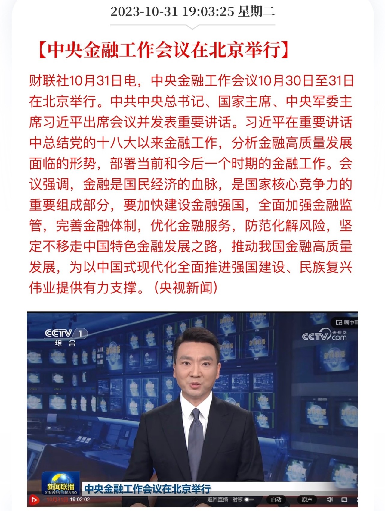 中央金融工作会议10月30日至31日在北京举行。中共中央总书记、国家主席、中央军委主席习近平出席会议并发表重要讲话。中共中央政治局常委李强、赵乐际、王沪宁、蔡奇、丁薛祥、李希出席会议。