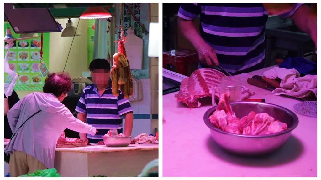 为什么肉菜的新鲜度 前后会有如此大的变化? 那是因为商家给食材开了“美颜灯” 也就是所谓的生鲜灯