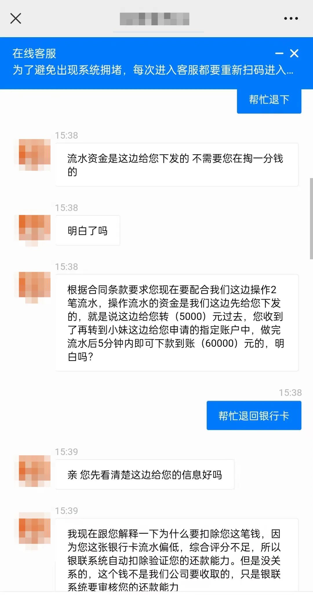 途中,对方告诉王先生,自动扣除钱款是因为其银行账户流水偏低,综合评分不足,待审核完成后,扣除的1万元会连同贷款一同返回银行账户。但王先生越想越害怕,坚持要求对方退款,对方又再次向其索要验证码,称审核成功后便会将钱退还给王先生。