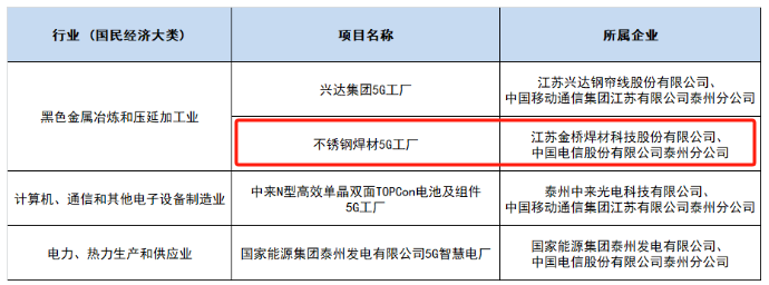 日前 工业和信息化部公示 《2023年5G工厂名录》 我区江苏金桥焊材科技股份有限公司 不锈钢焊材5G工厂 成功入选