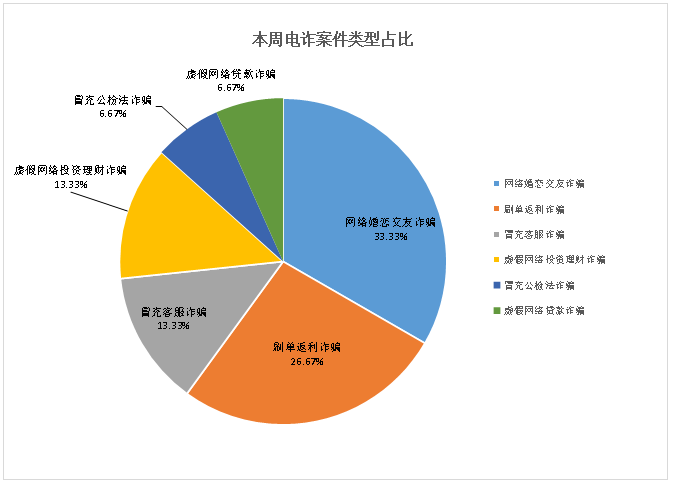 其中:网络婚恋交友诈骗5起,占比33.33%;刷单返利诈骗4起,占比26.67%;冒充客服诈骗2起,占比13.33%;虚假网络投资理财诈骗2起,占比13.33%;冒充公检法诈骗、虚假网络贷款诈骗各1起,各占比6.67%。