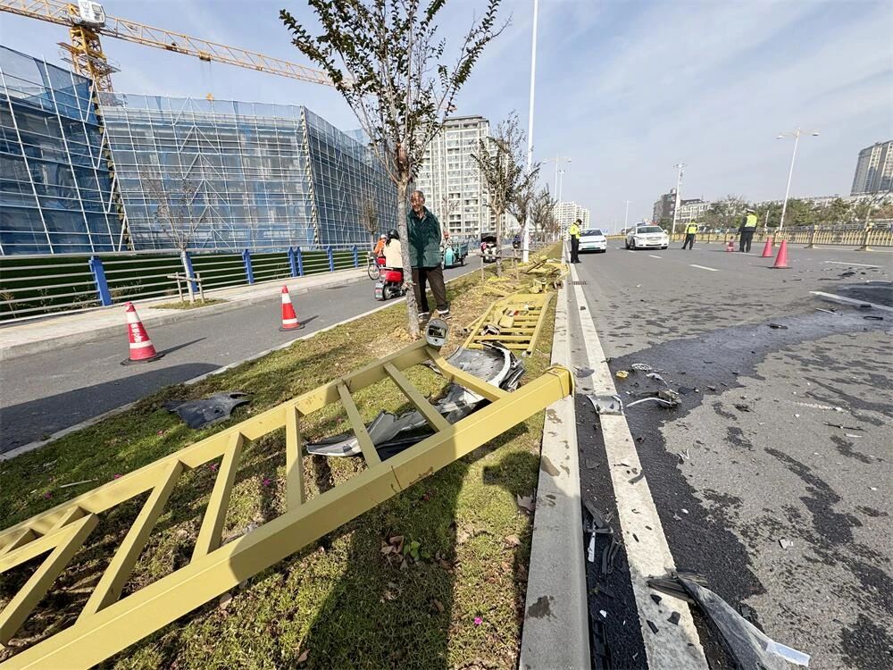 目击者周先生说,事发时,白色别克轿车直行过程中突然加速,随后径直撞向了道路中间防护栏,恰巧对向车道一辆白色别克商务车开了过来,尽管别克商务车向右躲闪,但是因为距离太近,且事发非常突然,两车还是发生了碰撞,飞起的防护栏又波及到了另一辆大众途昂,肇事车辆失控来了个180度大转弯。事故发生后,肇事的白色小轿车驾驶人下车逃离现场。