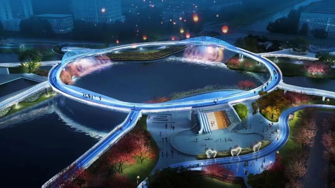 老通扬运河-中干河绿道景观提升一期工程共新建三座桥梁,三水之环桥便是其中一座,位于姜堰体育公园西南侧,中干河、老通扬运河交叉口处,主体平面为椭圆形,周长约400米,桥梁设计采用钢结构环形连续梁一跨过河,是“两河”滨河风光带城市专用慢行景观桥。