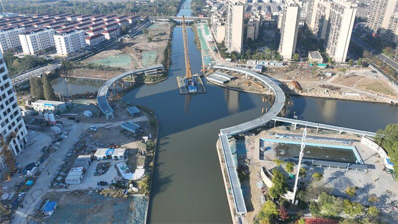 “三水之环”景观桥工程 地处老通扬运河与中干河交汇处 是老通扬运河-中干河绿道景观提升一期工程中 最引人关注的建设项目之一