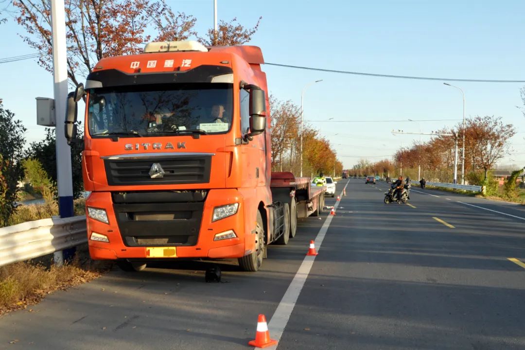 交警姜堰大队白米中队民警赶到现场后,看到一辆平板大货车停在路边,一辆车头严重损坏的二轮电动车倒在大货车尾部,地面上到处都是血迹,受伤的电动车驾驶人已经送医院治疗。