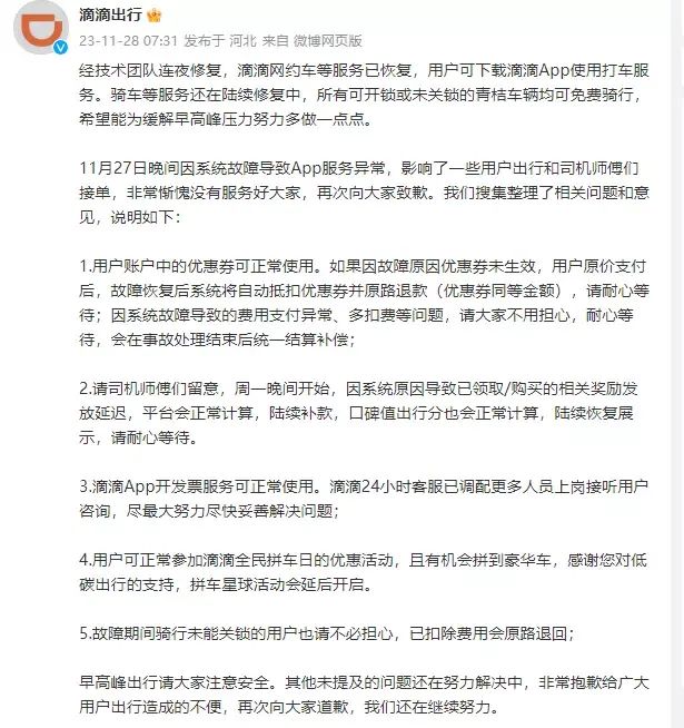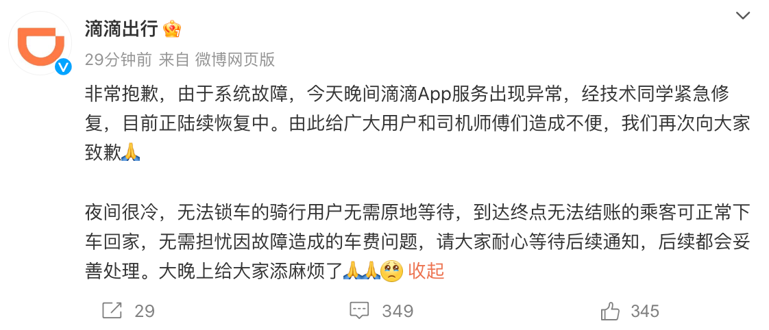 对此,@滴滴出行 回应称,非常抱歉,由于系统故障,今天晚间滴滴App服务出现异常,经技术同学紧急修复,目前正陆续恢复中。无法锁车的骑行用户无需原地等待,到达终点无法结账的乘客可正常下车回家,无需担忧因故障造成的车费问题,请大家耐心等待后续通知,后续都会妥善处理。