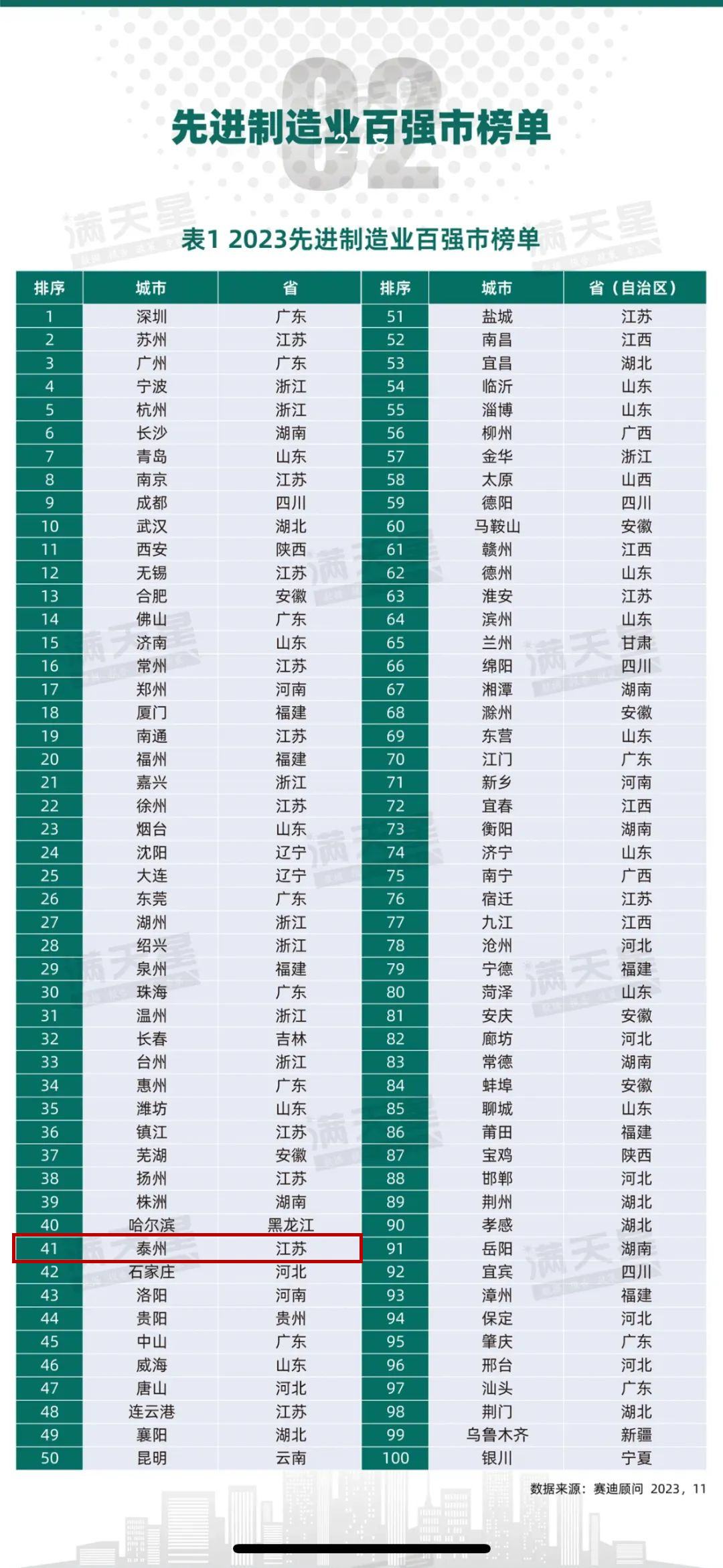 日前 赛迪顾问发布了 《2023先进制造业百强市研究报告》 泰州入选 先进制造业百强市(2023)榜单 位居全国第41位