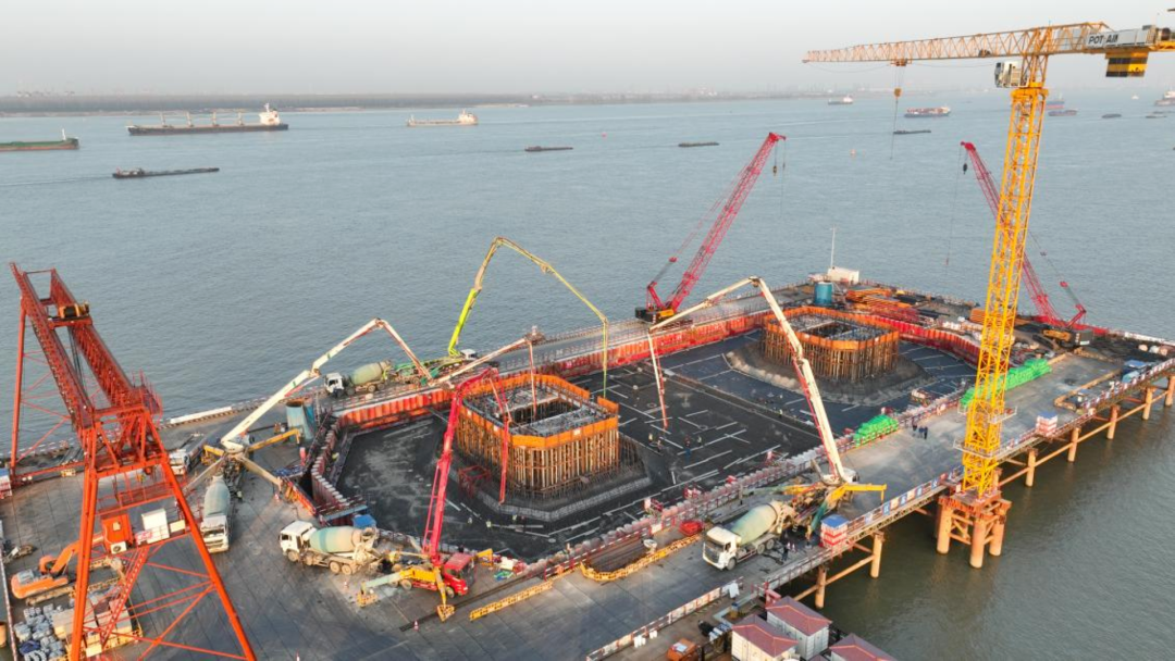 11月22日,张靖皋长江大桥南航道桥南主塔承台混凝土浇筑完成,这座江中主塔将转入“拔节长高”的新阶段。