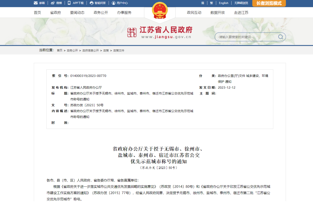 省政府办公厅近日印发《关于授予无锡市、徐州市、盐城市、泰州市、宿迁市江苏省公交优先示范城市称号的通知》。《通知》指出,经省人民政府同意,决定授予无锡市、徐州市、盐城市、泰州市、宿迁市第二批“江苏省公交优先示范城市”称号。