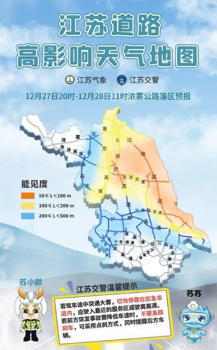 受雾霾天气影响,徐州、连云港、宿迁、淮安、盐城、泰州、南通、扬州、无锡等市部分高速公路实行特级(道路封闭)交通管制措施。