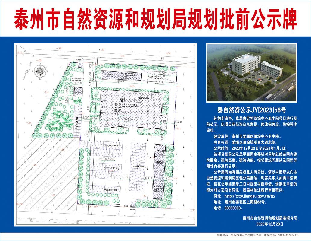 近日,泰州市自然资源和规划局发布了《泰州市姜堰区蒋垛镇中心卫生院》批前公示。