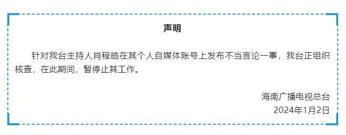 海南广播电视总台微信公众号 1月2日晚间发布声明: 针对我台主持人肖程皓 在其个人自媒体账号上 发布不当言论一事 我台正组织核查 在此期间,暂停止其工作 1月1日,日本石川县能登半岛发生7.6级地震。当天,微博与抖音认证为媒体人的“主持人程皓”发布视频称:“报应来了?日本突发7.4级地震!”该视频引起网民热议。 记者从海南广播电视总台纪检监察室工作人员处了解到,他们已收到相关反映,并称会让其删除相关视频。 资料显示,肖程皓是海南广播电视总台主持人、一级播音员,现主持《海南新闻联播》。2014年至2017年曾连续四年获海南广电观众节“十佳主持人”称号 。