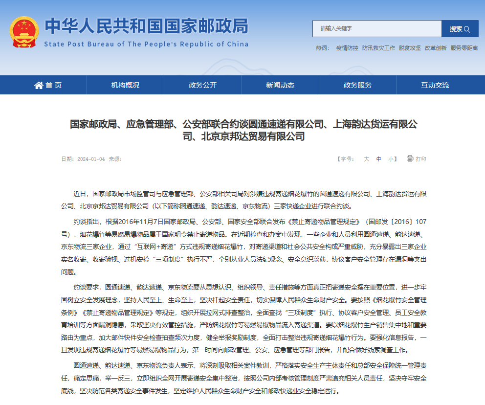 约谈要求,圆通速递、韵达速递、京东物流要从思想认识、组织领导、责任措施等方面真正把寄递安全摆在重要位置,进一步牢固树立安全发展理念,坚持人民至上、生命至上,坚决扛起安全责任,切实保障人民群众生命财产安全。要按照《烟花爆竹安全管理条例》《禁止寄递物品管理规定》等规定,组织开展拉网式排查整治,全面查找“三项制度”执行、协议客户安全管理、员工安全教育培训等方面漏洞隐患,采取坚决有效管控措施,严防烟花爆竹等易燃易爆物品流入寄递渠道。要以烟花爆竹生产销售集中地和重要路由为重点,加大邮件快件安全检查抽查频次力度,健全举报奖励制度,全面打击整治违规寄递烟花爆竹行为。要强化信息报告,一旦发现违规寄递烟花爆竹等易燃易爆物品行为,第一时间向邮政管理、公安、应急管理等部门报告,并配合做好线索调查工作。