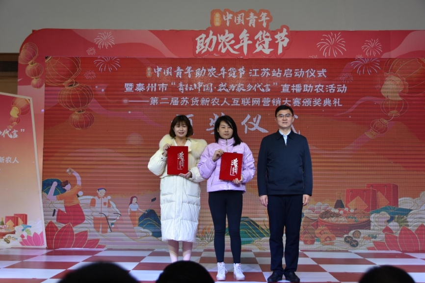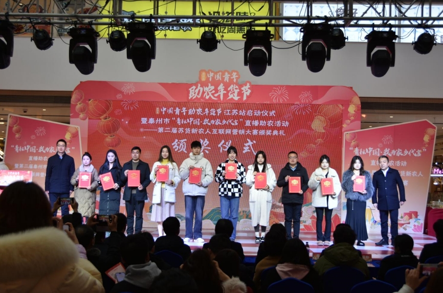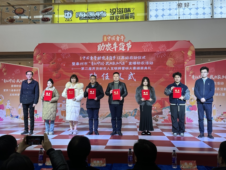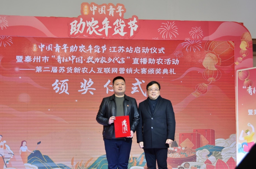 1月27日上午,第四届中国青年助农年货节江苏站启动仪式暨泰州市“青耘中国·我为家乡代言”直播助农活动——苏货新农人互联网营销大赛颁奖典礼在泰州中骏世界城举行。