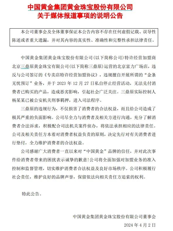 [color=rgba(0, 0, 0, 0.9)]公告称,公司特许经营加盟商北京三鼎原黄金珠宝有限公司(以下简称三鼎原)运营的北京富力广场店,违反与公司签订的《专卖店特许经营加盟协议》,违规擅自开展所谓的“金条无忧预订”业务,并于2023年12月27日私自停止经营活动,无法兑付消费者已购买的产品,造成恶劣影响,引起社会广泛关注。三鼎原实际控制人杨某某已被公安机关刑事羁押,进入司法程序。