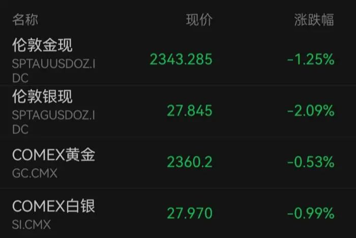 4月12日,一度冲破2400美元大关的国际金价盘中大跳水,伦敦现货黄金收跌1.25%,报2343.29美元/盎司;COMEX黄金期货收跌0.53%,报2360.2美元/盎司。