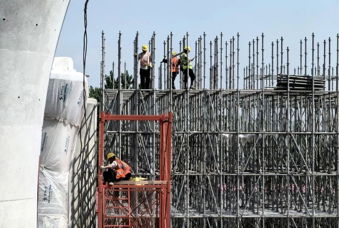 目前,高铁泰州南站区域,墩身施工步入尾声,即将转入道岔现浇梁施工工序。