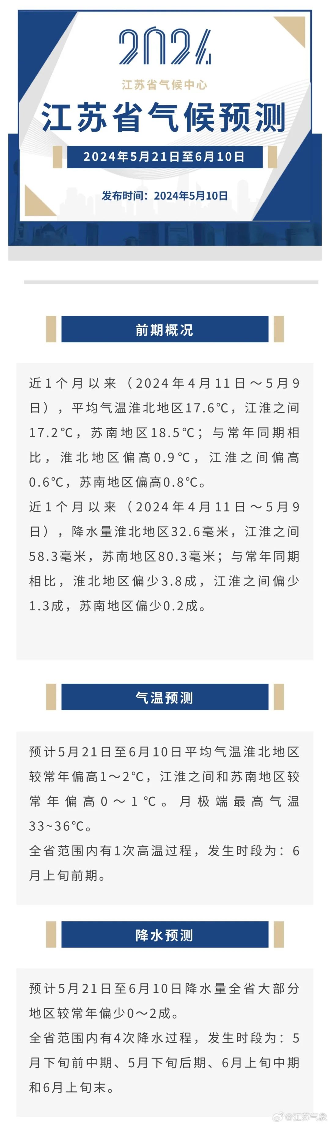 2024年5月10日,江苏省气候中心发布,全省5月21日至6月10日气候预测→