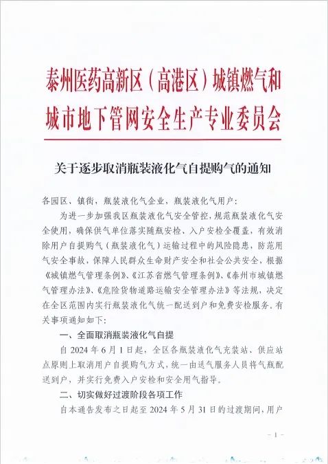 据了解,今年4月份以来,医药高新区(高港区)发布逐步取消瓶装液化气自提购气的通知,同时积极推进辖区内3家液化气储配站(泰州市亚平洋液化气有限公司、泰州市金马液化气有限公司、开发区凤凰路液化气站)同海陵区的5家液化气站整合,目前已完成经营许可证申领,正在办理充装许可证,预计6月底前完成。