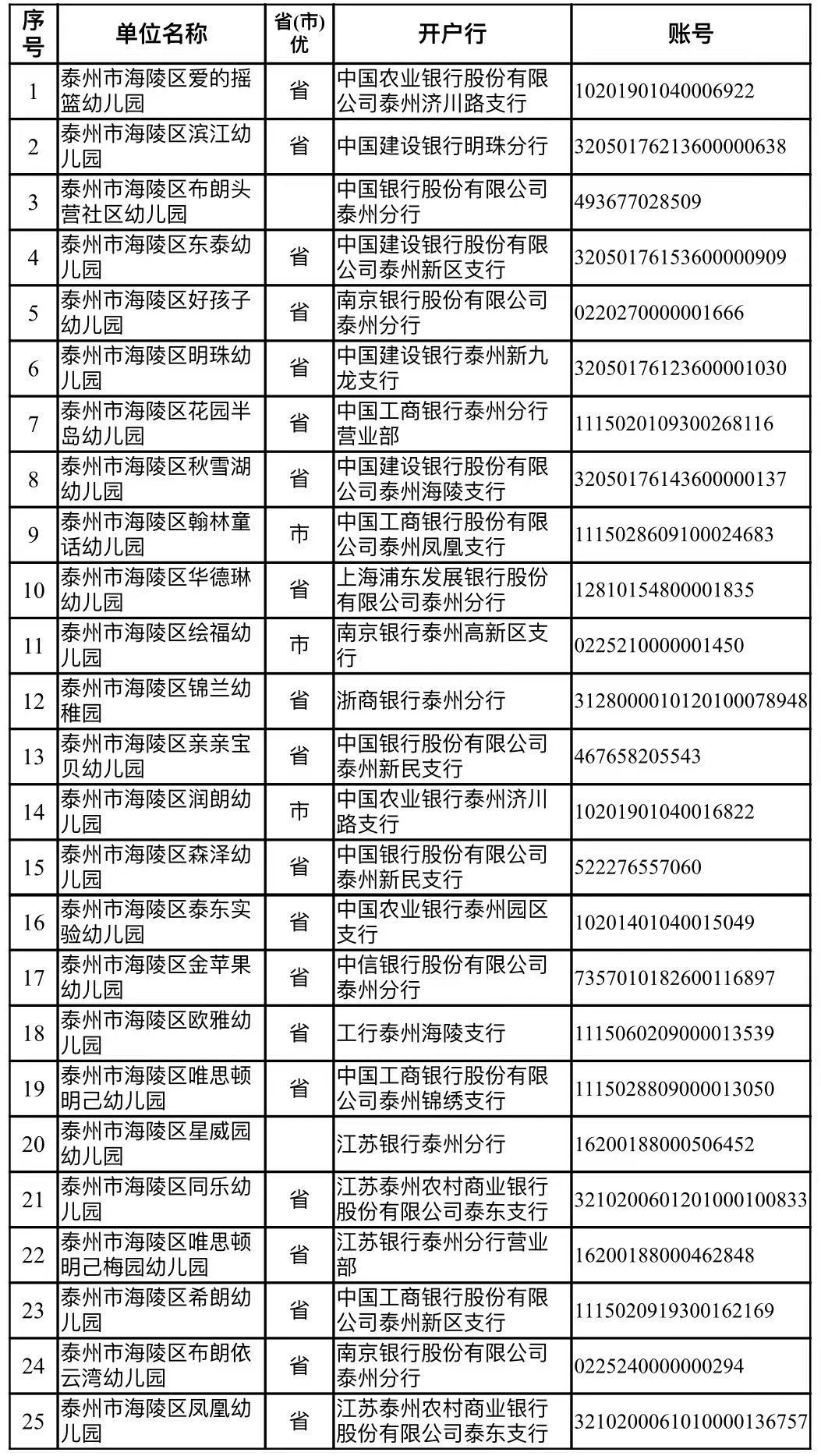 3.家长缴费请缴至幼儿园备案账户(具体见“海陵区民办幼儿园备案账户一览表”),不要缴至其他任何单位或个人账户。