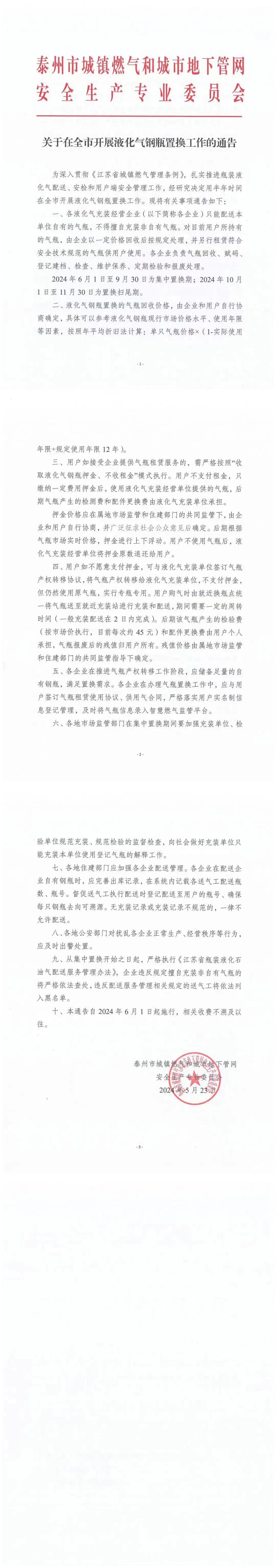 为深入贯彻《江苏省城镇燃气管理条例》,扎实推进瓶装液化气配送、安检和用户端安全管理工作,经研究决定用半年时间在全市开展液化气钢瓶置换工作。现将有关事项通告如下: