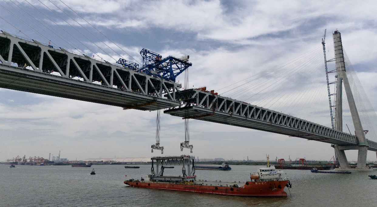 此次吊装的合龙段钢桁梁长14米,宽35米,重约800吨。合龙段吊装完成后,后续10天左右时间,将按照先边跨后中跨的顺序进行合龙施工。