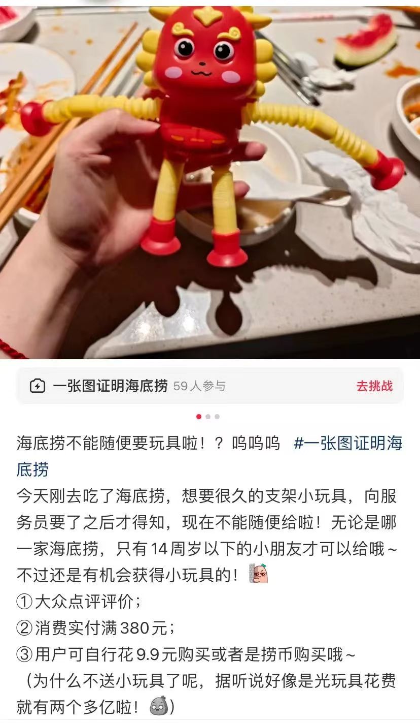近日,有多名网友在社交平台上发文称,湖北多家海底捞门店大人不能免费领取玩具了