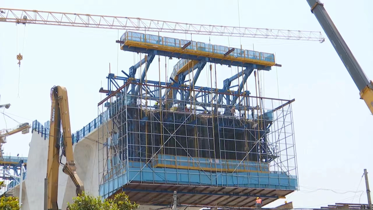 下一步将进行道岔梁的现浇施工 计划年底完成 现浇任务完成后 进行桥面系的建设 包括无砟轨道板铺设等