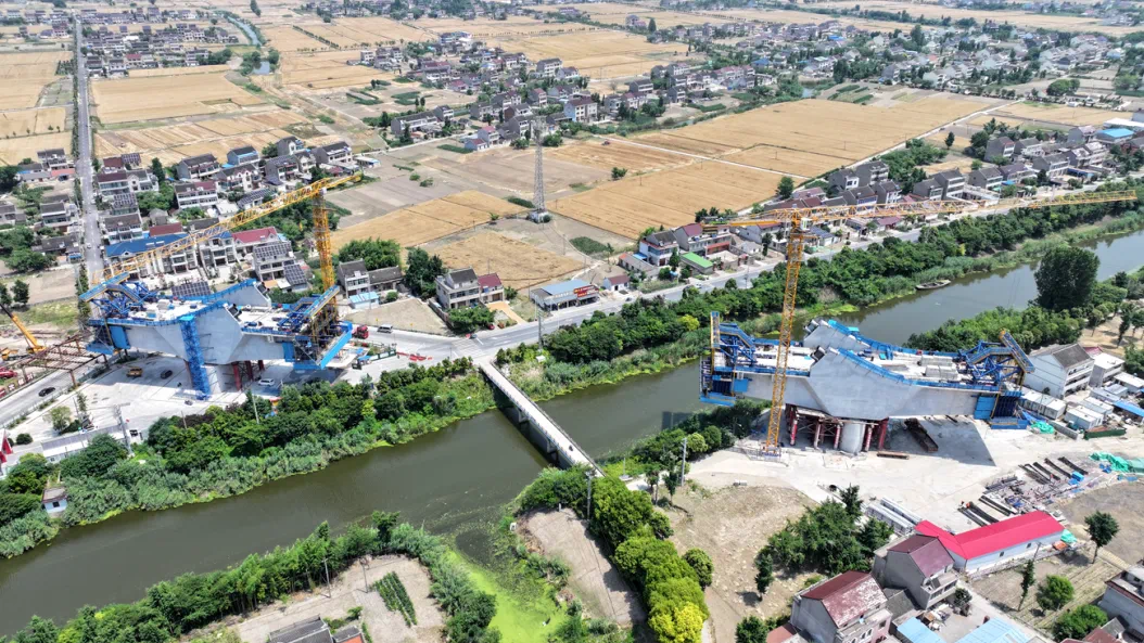在中铁十一局站前9标 跨X355县道和如泰运河 主跨168米连续梁拱施工现场 工程正紧锣密鼓施工中 这是北沿江高铁泰州段 最大的连续梁拱 设有1391主墩和1392主墩