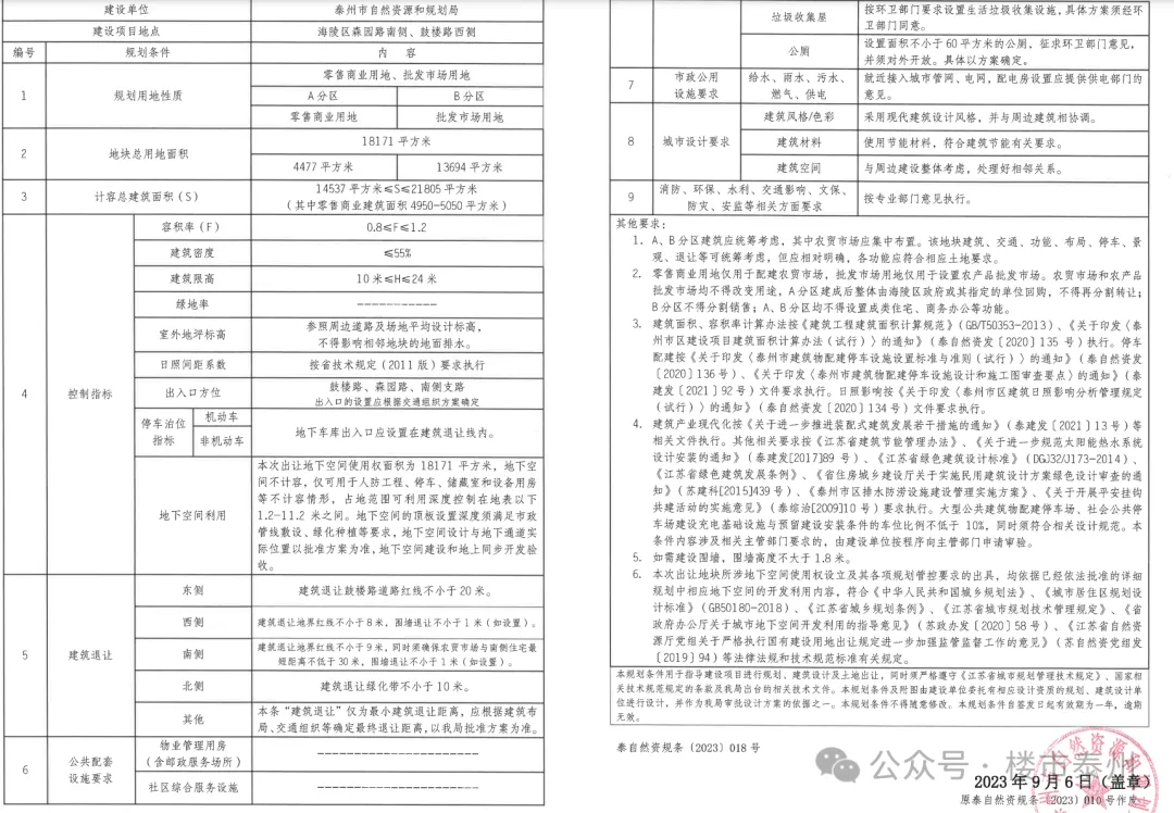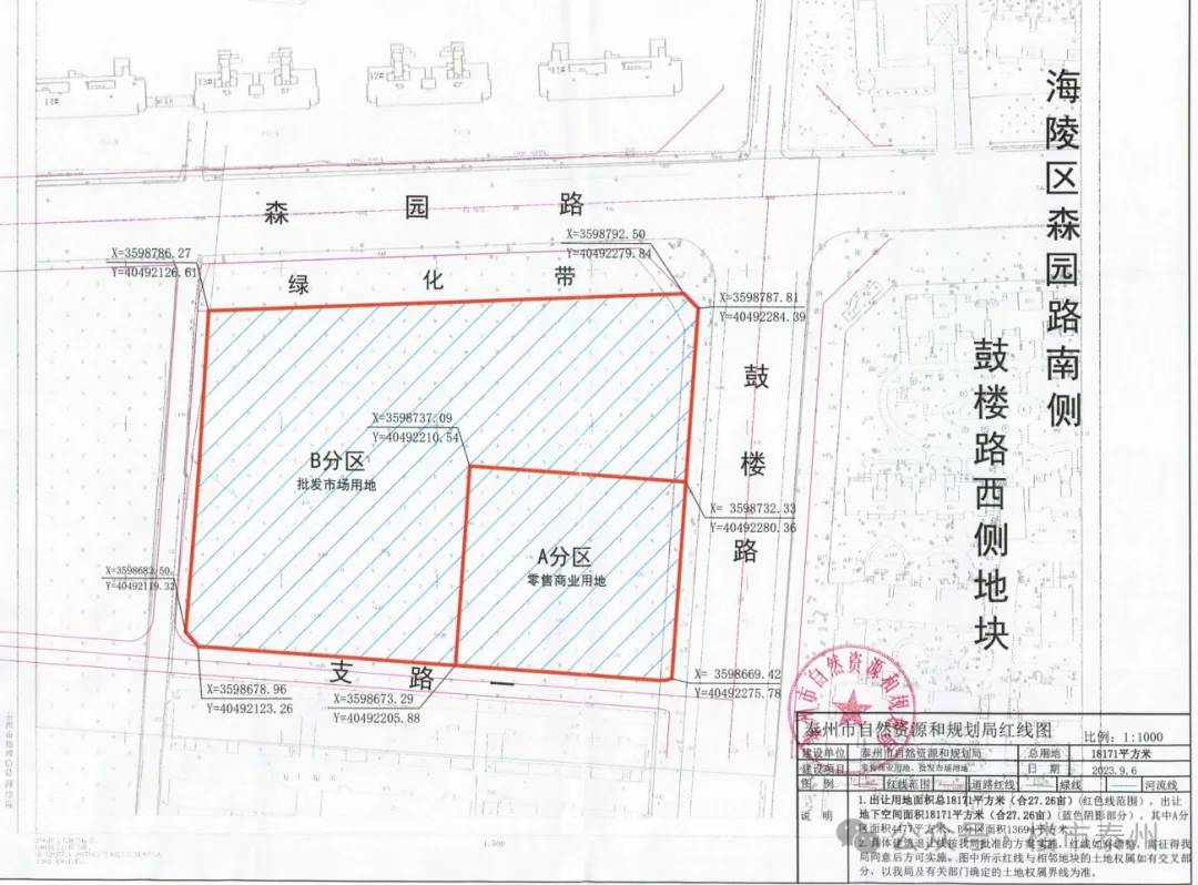 根据投资监管协议,海陵区森园路南侧、鼓楼路西侧地块商业项目,分为A、B两区,其中A分区为零售商业用地,用地面积4477平方米B分区为批发市场用地,用地面积13694平方米。