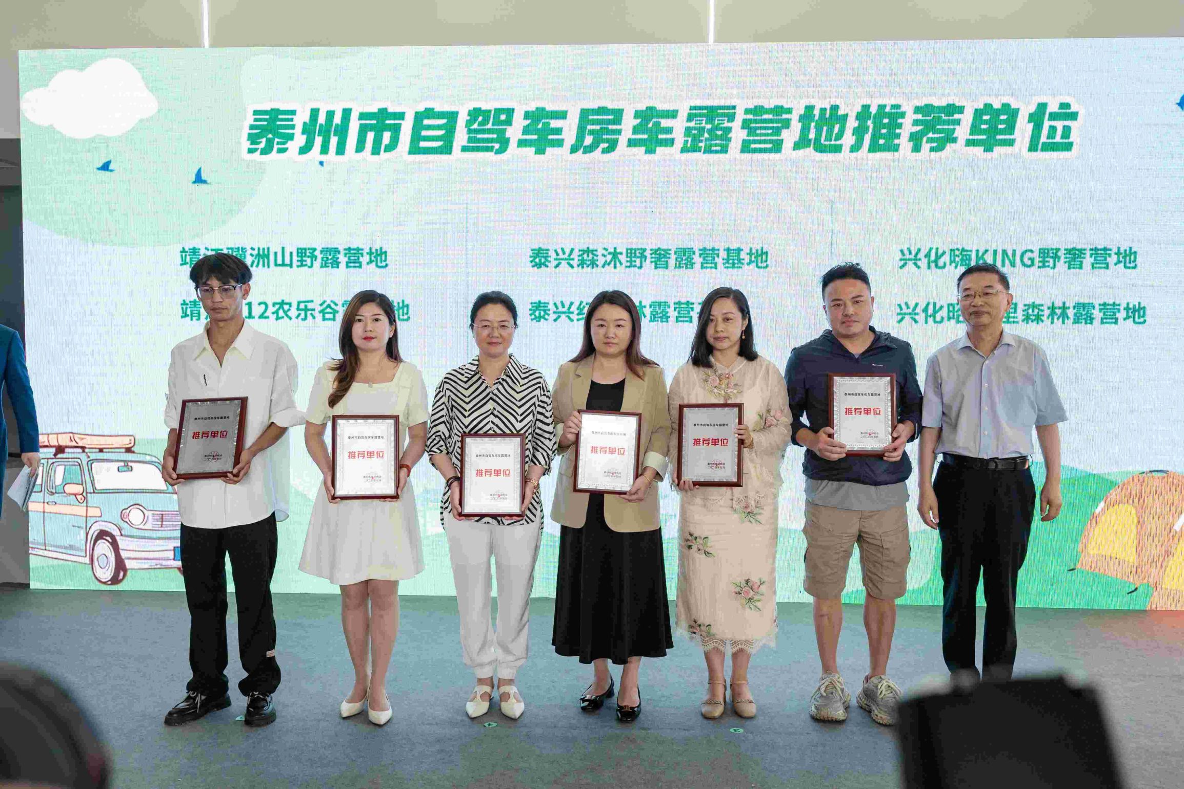 为吸引广大房车、自驾游客,满足日益增长的露营度假旅游需求,泰州市旅游协会推荐了一批自驾车房车露营地单位。活动现场,为泰州月途精致露营地、靖江骥洲山野露营地、兴化嗨king野奢营地等首批12家单位进行授牌。