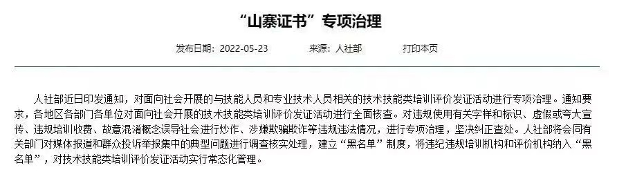 “山寨证书”专项治理行动