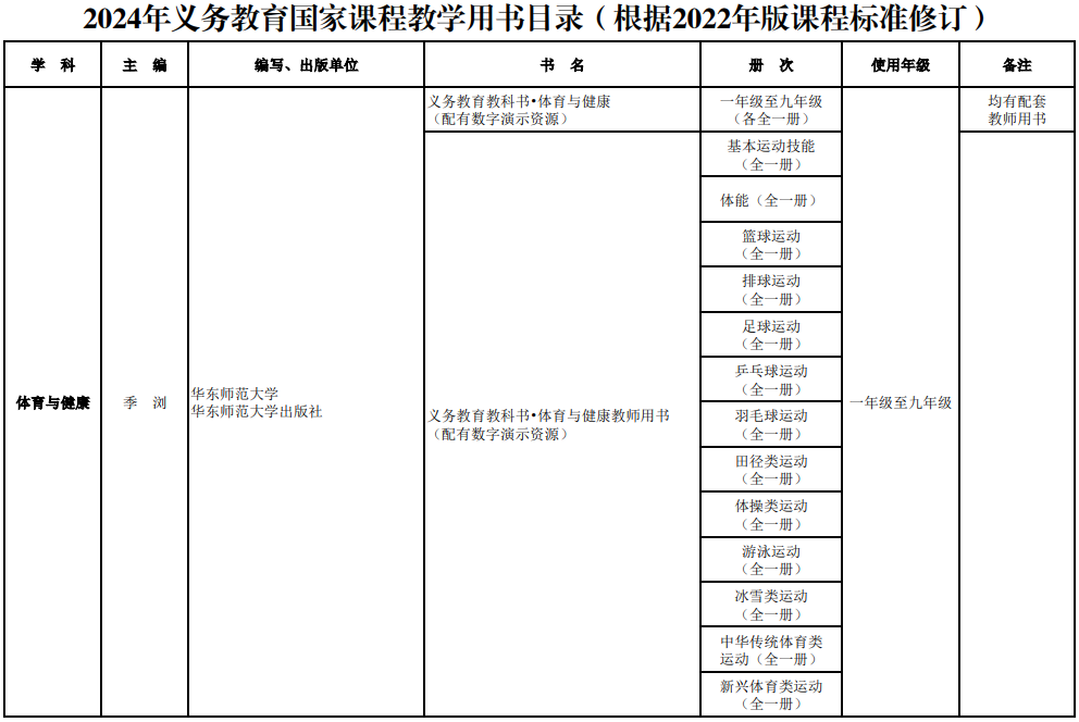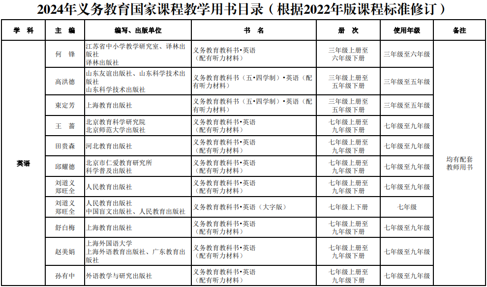 1、《2024年义务教育国家课程教学用书目录(根据2022年版课程标准修订)》中的外语类教材配有听力材料、体育与健康教材配有数字演示资源,各地秋季开学后可在国家中小学智慧教育平台免费使用。